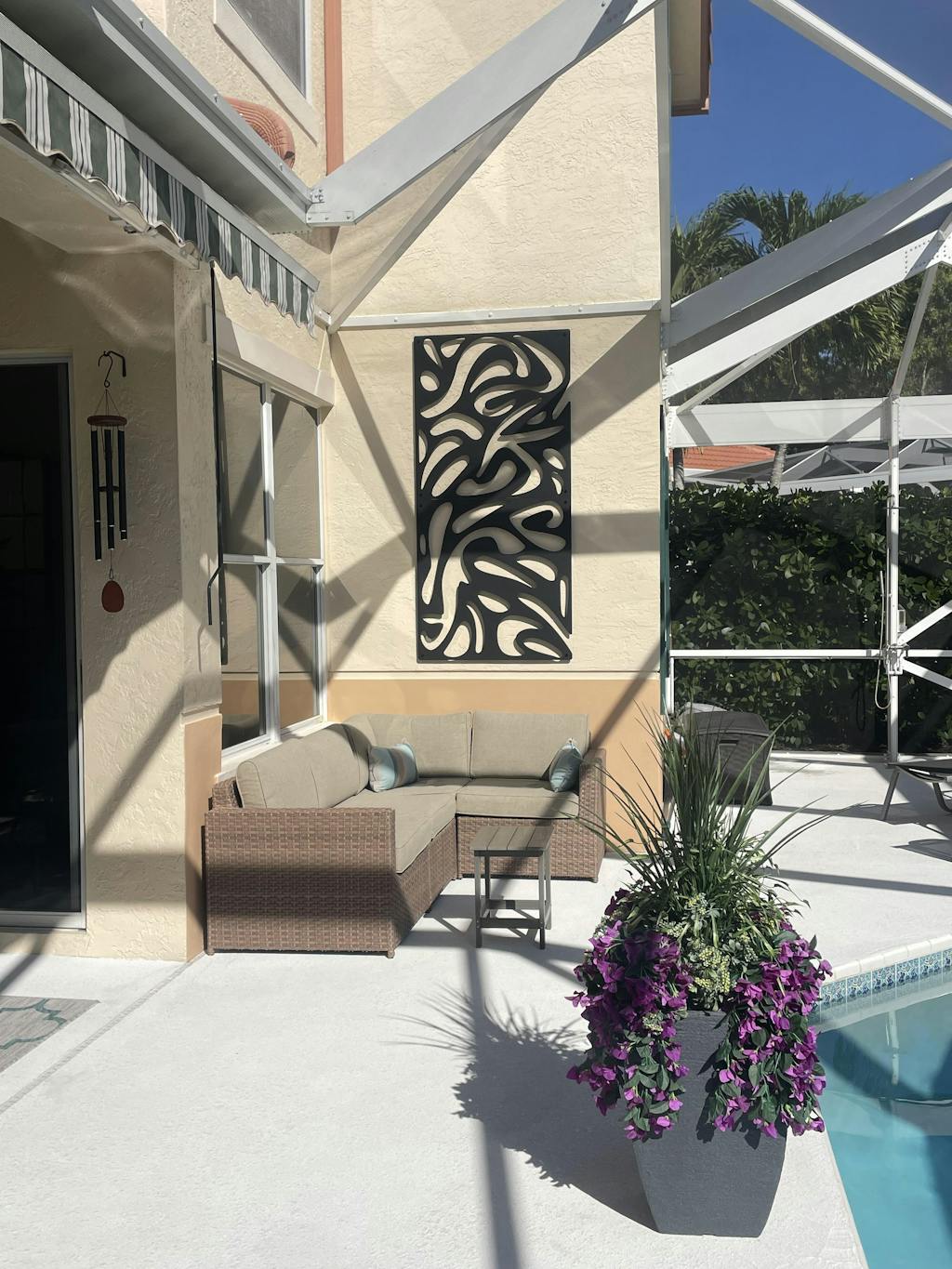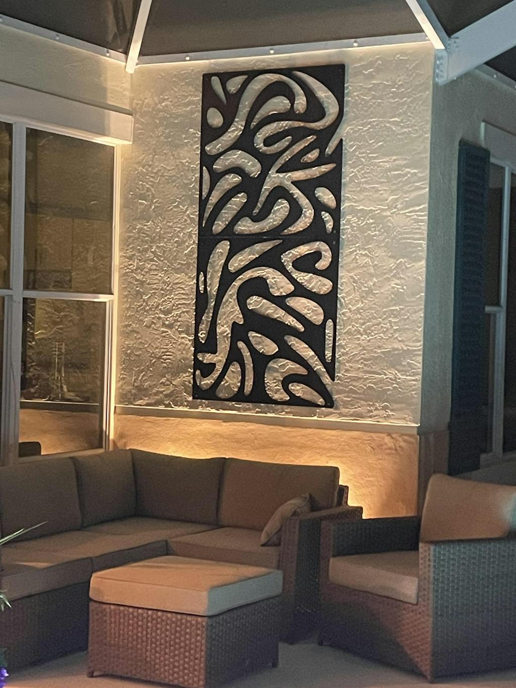 We love our new wall art. Its so modern and chic. We have gotten so many compliments. It definitely sets the theme of the lanai. We got the idea to enhance it at night time with 2 spotlights from another reviewer. Communication was great, came wrapped very secure and arrived quickly. We live in South Florida. Its perfect for the space.