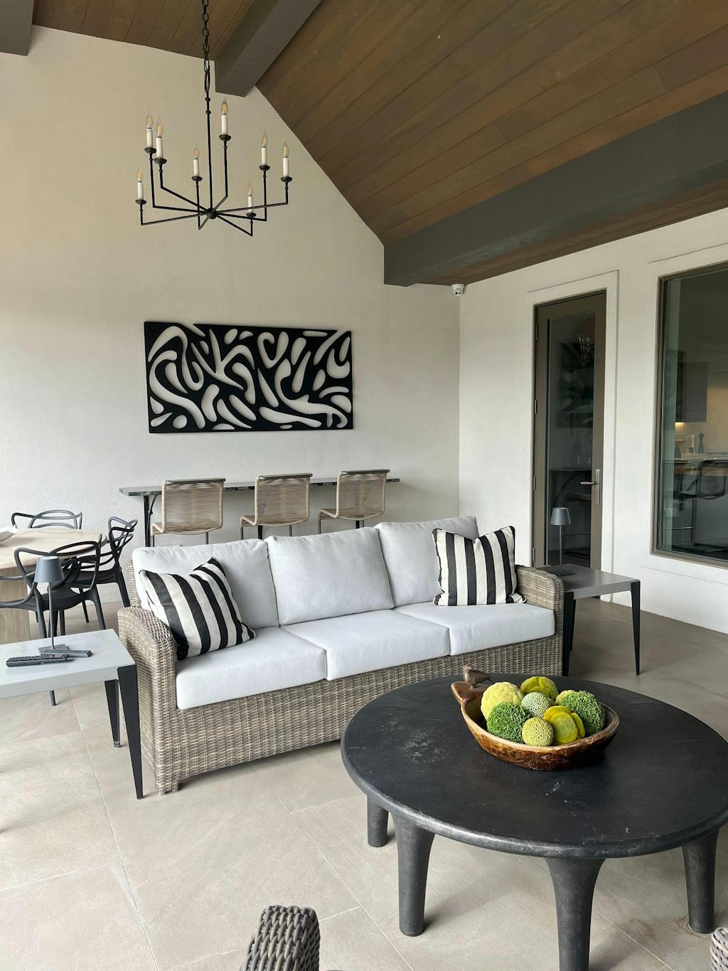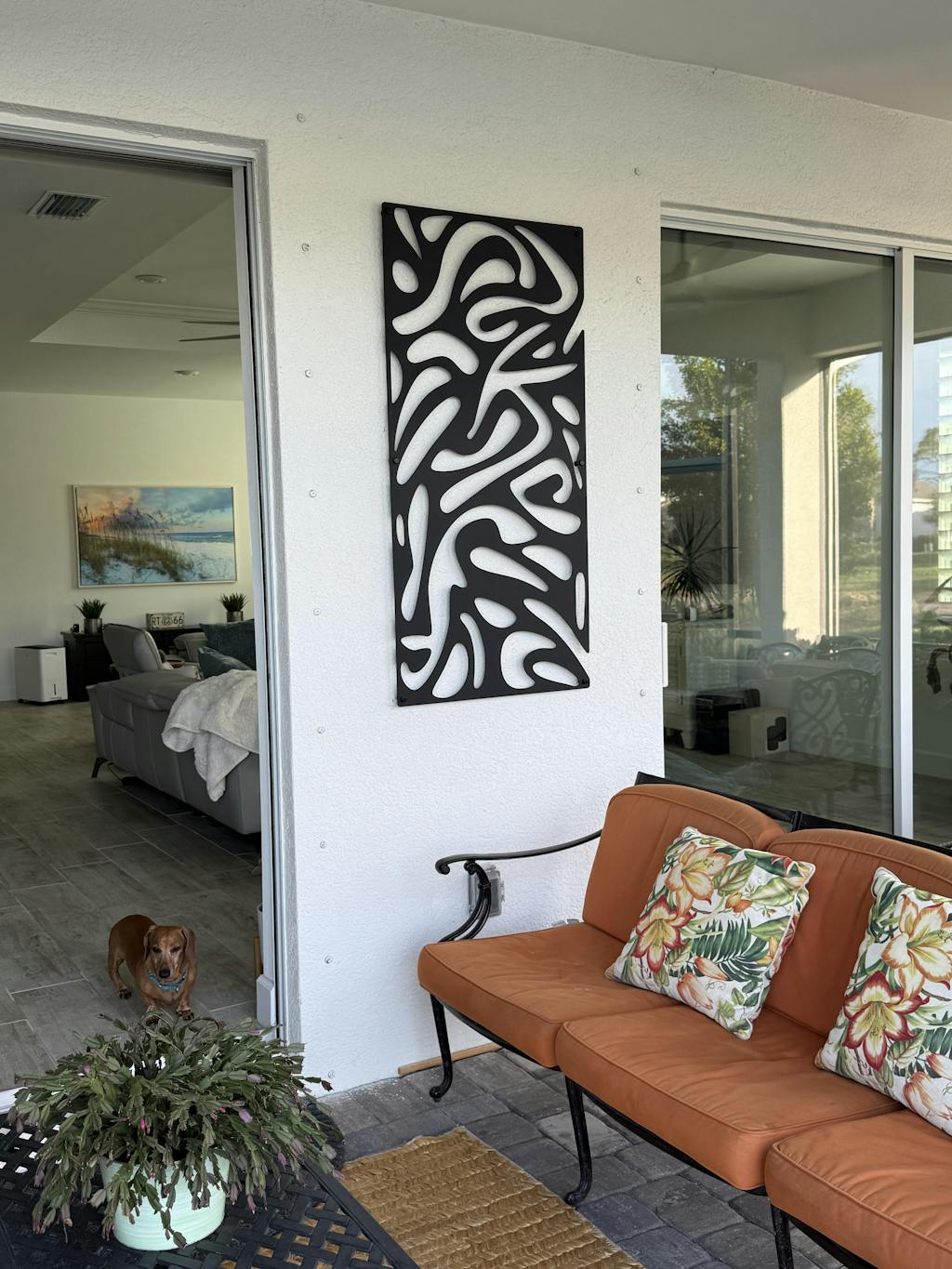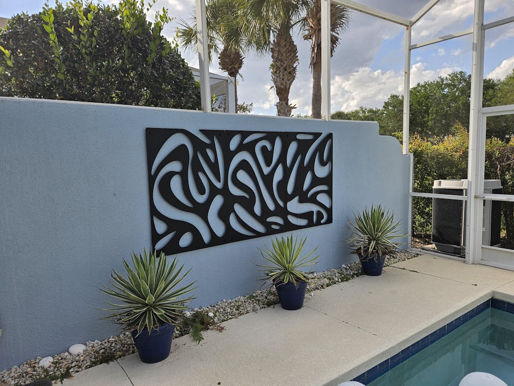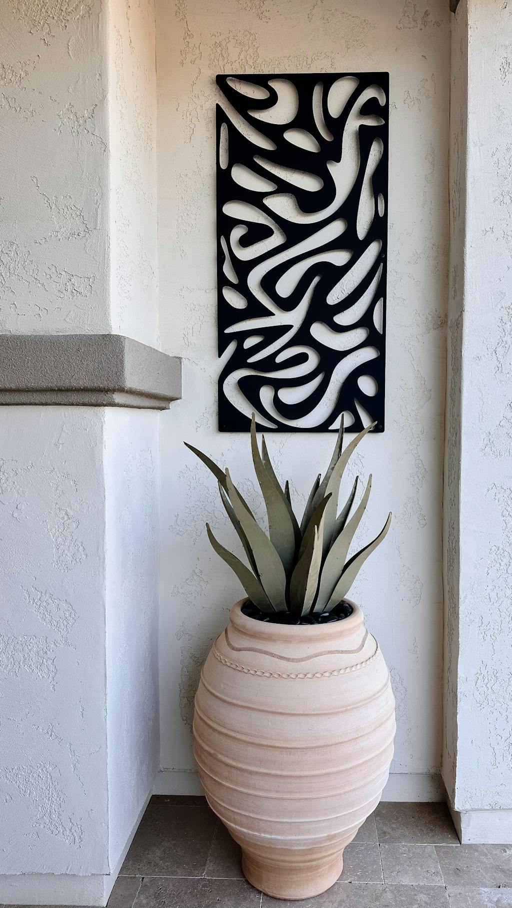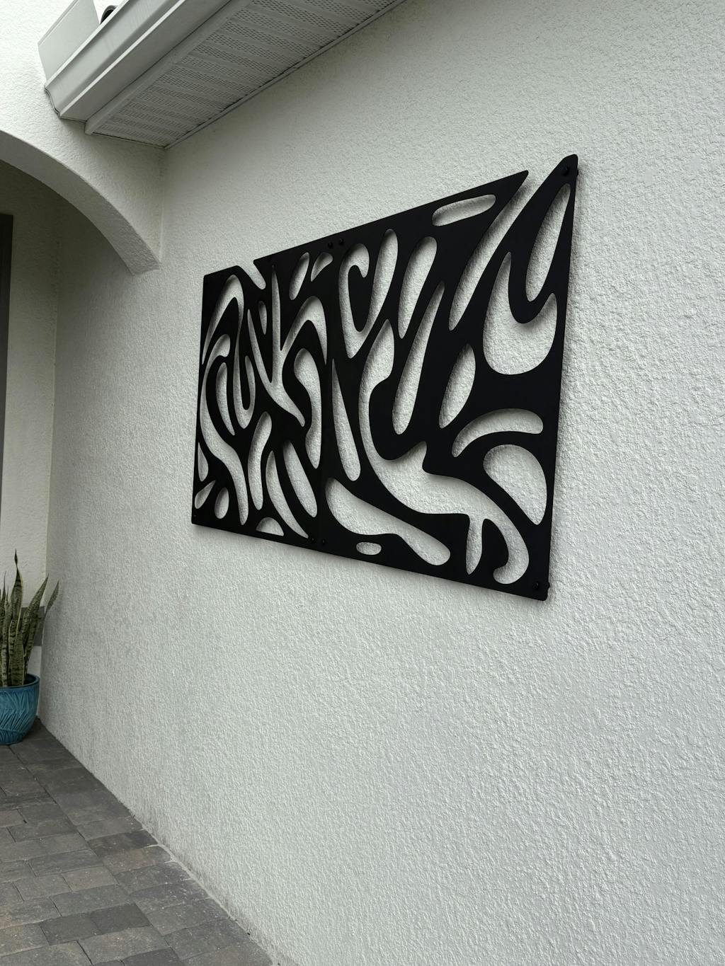 Unsere wetterfeste Outdoor-Metall-Wanddeko ist in vier Größen erhältlich: Mittel (96x46cm), Groß (137x66cm), Extra Groß (188x91cm) und Jumbo (236x115cm). Gefertigt aus 2mm hochwertigem Aluminium mit einer supermatten schwarzen Pulverbeschichtung ist diese Wanddeko witterungsbeständig für ganzjährigen Außeneinsatz. Hängen Sie sie horizontal oder vertikal auf, um Ihren Raum zu ergänzen. Das moderne, abstrakte Design verleiht jedem Außenbereich Stil - perfekt für Terrassen, Poolbereiche, Gärten oder Außenwände.